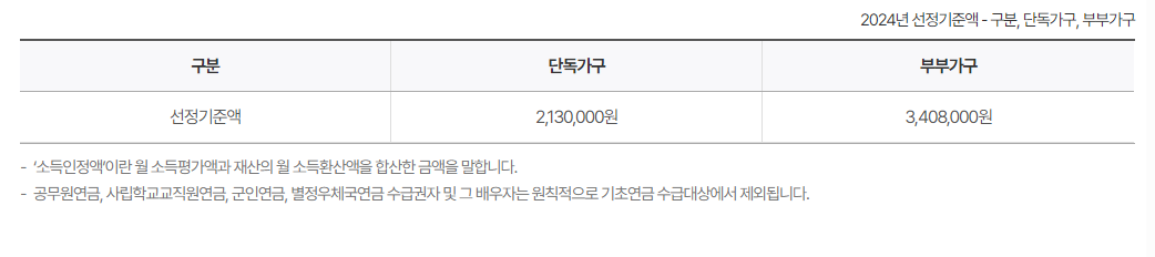 이 기준들은 올해도 작년과 동일하게 적용되었습니다. 따라서, 이 조건을 충족하는 만 65세 이상의 국민은 기초연금 수급 자격이 주어집니다.