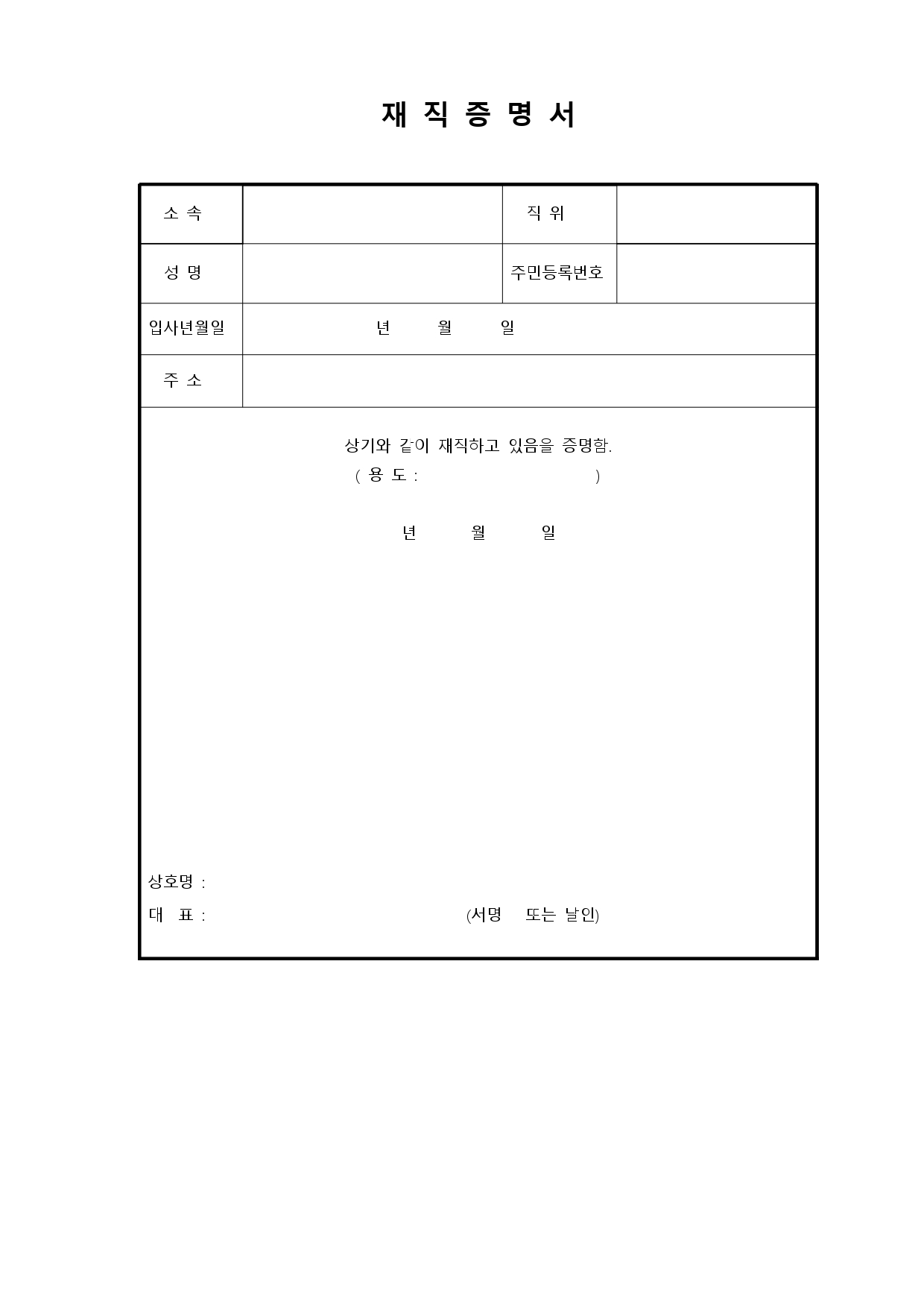 인적사항에 성명, 주민번호(생년월일로 수정가능), 주소, 회사명, 사업자번호, 대표자, 대표전화, 소재지, 근무부서, 직급, 재직기간, 사용용도, 날짜, 회사명, 대표이사 이름, 그리고 도장을 찍어주시면 됩니다.