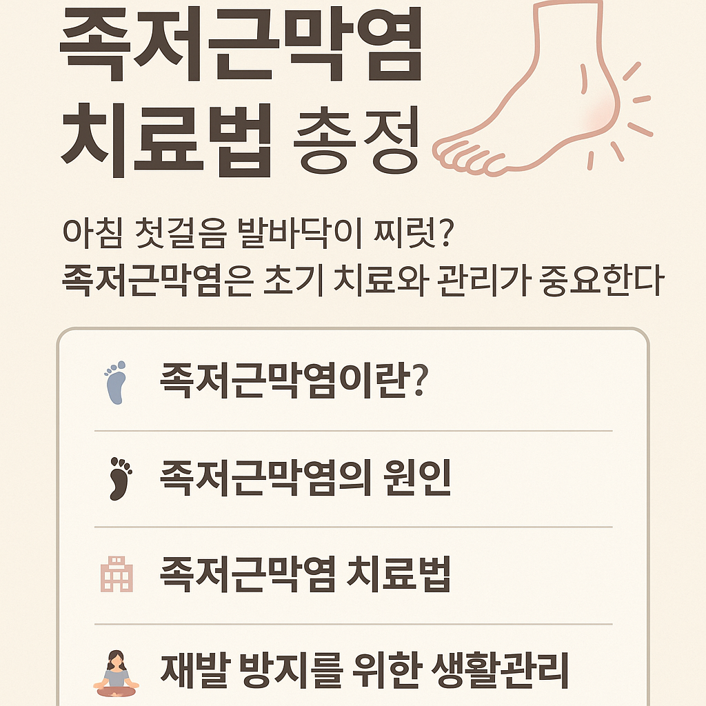 족저 근막염은 초기에 관리하지 않으면 통증이 만성화되어 무릎·허리까지 영향을 줄 수 있는 질환이지만, 반대로 원인만 알면 대부분 수술 없이 회복할 수 있는 질환이기도 합니다.